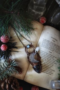 The Snow Moon is the darkest moon of the year. A moon shining in the heart of winter, as the earth sleeps. This Amulet holds a beautiful rainbow filled clear quartz crescent moon, wtih a unique black agate teardrop below. Surrounded by copper plated cedar branches, and topped with a beautiful rainbow moonstone.
